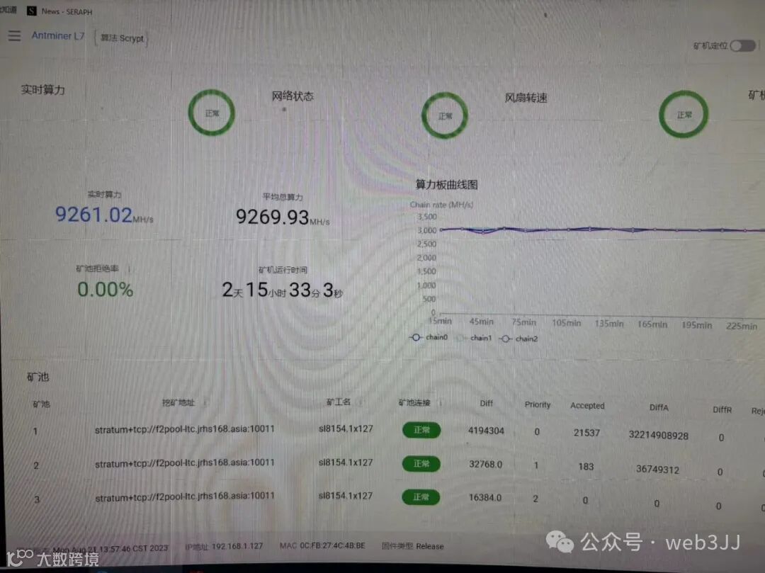 经过我们这一段时间的测试,L7的实际运行算力基本维持在9.3-9.8之间,功耗稳定在3425W附近,这点非常符合官方给出的数据。