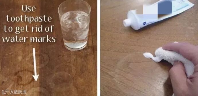 桌子尤其是玻璃材质表面的桌子总是擦了又擦,还是有一大片水渍,只需涂抹点牙膏擦洗,污渍立刻不见。