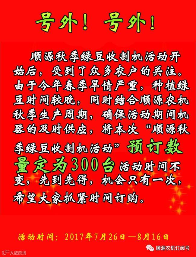 注意:本次优惠活动只有300台绿豆收割机参与预订,请大家抓紧时间预订抢购!!!