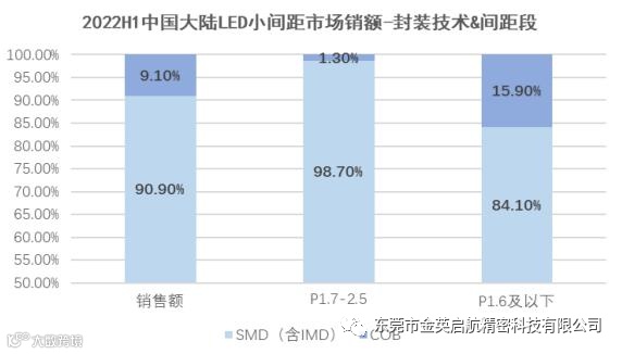根据 DISCIEN(迪显)《中国 LED 小间距市场研究报告》统计,2022 年上半年中国 LED 小间距销额为 78 亿元,同比增长 10.2%。分技术看,LED小间距市场依然以 SMD 为主,销额占比超 9 成,COB 份额同比基本持平,主要由于 COB 产品以行业端项目为主,而上半年行业端项目需求增长不明显,未拉动COB 市场增长;但分间距段来看,COB 间距微缩化进程更快,其主要以 P1.6 及以下出货为主,在其内部占比已近 16%,明显高于整体市场占比,未来随着间距不断收窄, COB 产品优势也将持续凸显。