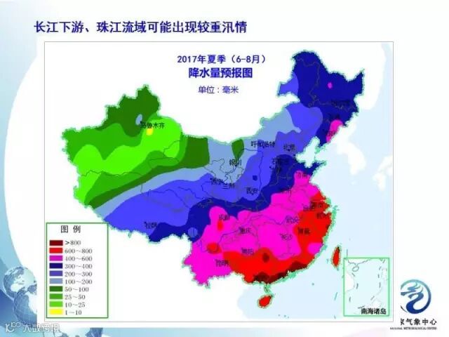 上图是6到8月的降水预报,预计今年夏天,东北地区北部、内蒙古东北部降水偏多,而且东北地区北部可能出现严重的洪涝。长江下游、珠江流域出现较重汛情的概率比较大。