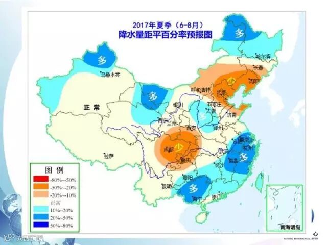 上图是降水量距平百分率,上图清晰的表明了与常年同期相比各地降水量的变化,蓝色区域表明降水量比常年同期偏多,橙色区域表明比常年同期偏少,颜色越深,表明变化越大,其他地方降水量正常。