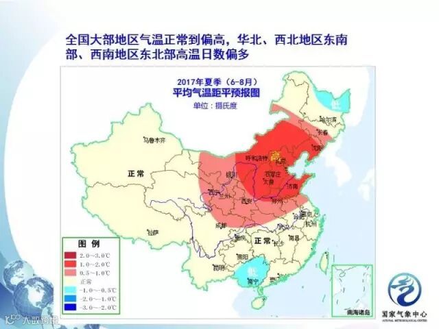 上图是6到8月平均气温的距平预报图。上图表明,全国大部分地区气温正常到偏高,华北、西北地区东南部、西南地区东北部高温日数偏多。