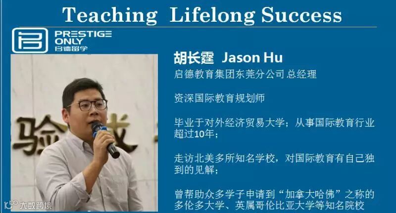 3月18日周六,英凯教育*环球雅思东莞学校将举办出国留学公益讲座,讲座嘉宾特邀请到了东莞启德留学公司总经理--胡老师为大家面对面留学解惑,他从事10年的教育行业,帮助很多学子申请到国外名校,是资深国际留学规划师,胡老师讲座现场除了给大家解惑外,还提供15分钟的自由提问环节!