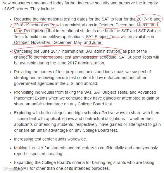 根据CB官网文章的消息,CB取消今年6月海外考场的SAT考试,是为了提高SAT考试的“安全性”,这里不免让人联想到CB历史上多次试题泄露事件。