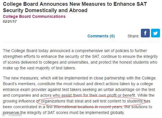 Collegeboard不断面临考试安全和公平问题的挑战,过去两年Collegeboard不断取消SAT考试成绩,亚太地区尤其是重灾区。此次Collegeboard使出强硬手段,称将把涉及作弊和泄题的考试培训机构举报给司法机构,将涉及作弊的学生名单告知所有大学或中学,凡涉及作弊的学生将取消参加SAT,SAT II, AP等所有考试资格。