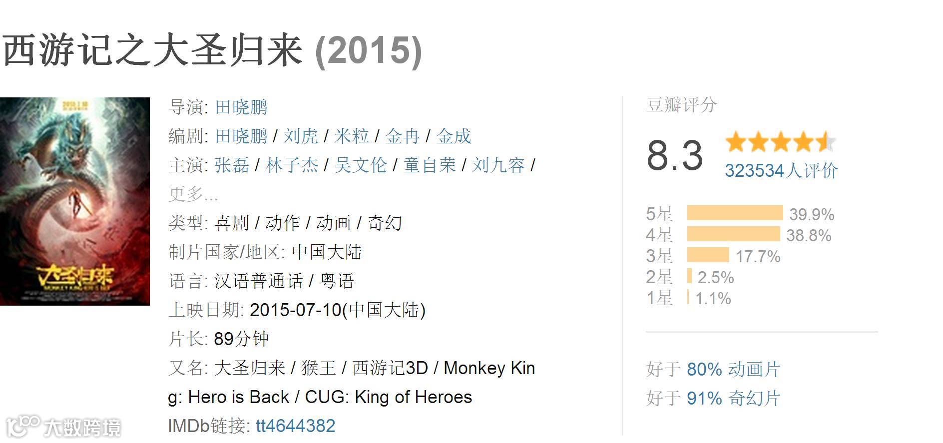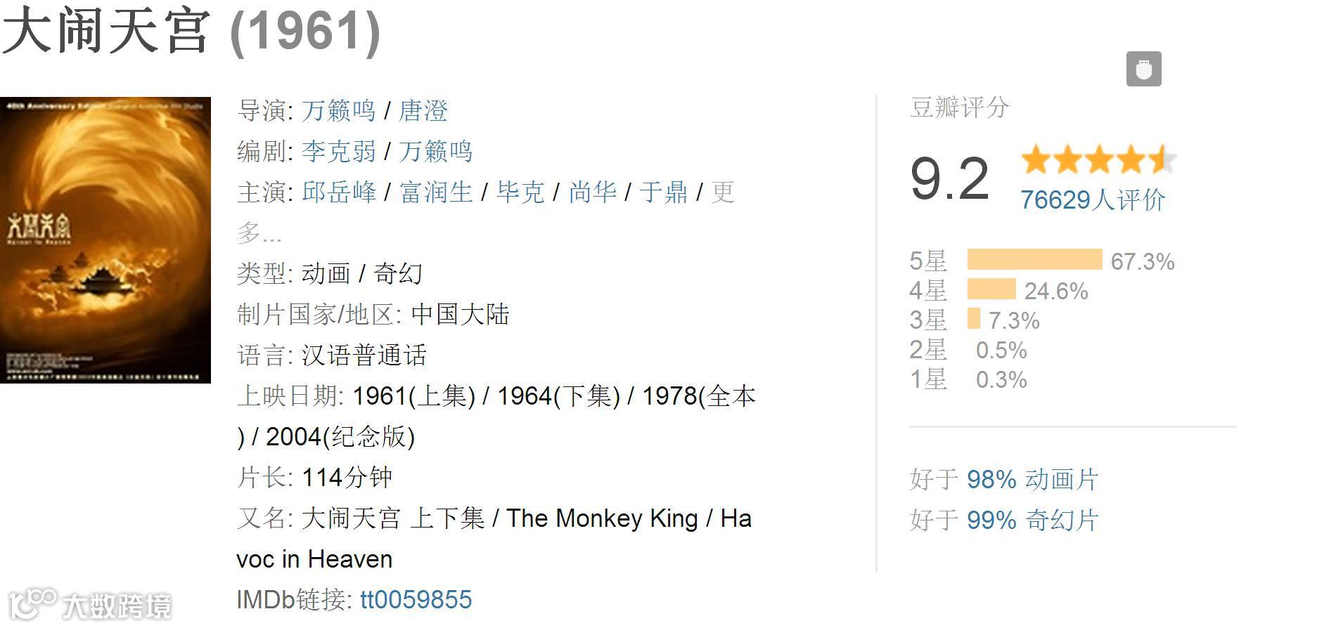 豆瓣电影上,《大闹天宫》评分9.2,远远高于前段时间好评如潮的《大圣归来》和最近的《大鱼海棠》。