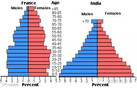 The charts below compare the age structure of the populations of France and India in 1984.