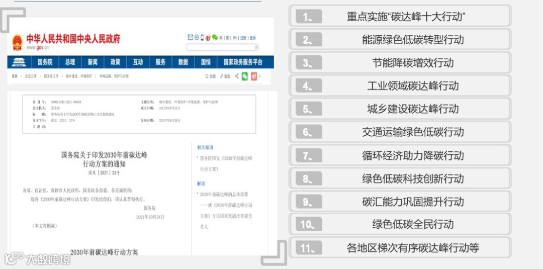 国务院于2021年10月24日颁布的《2030年前碳达峰实施方案》中,列出了要求重点实施的“碳达峰十大行动”(见下图),涉及到多个领域,每个领域中也有比较详细的部署。多数行业主管部门、多家中央企业和多个地区也陆续发布了各自的碳达峰行动方案。这些指导性文件正在对各行业各地区实现高质量转型发展发挥着愈来愈重要的指导作用。