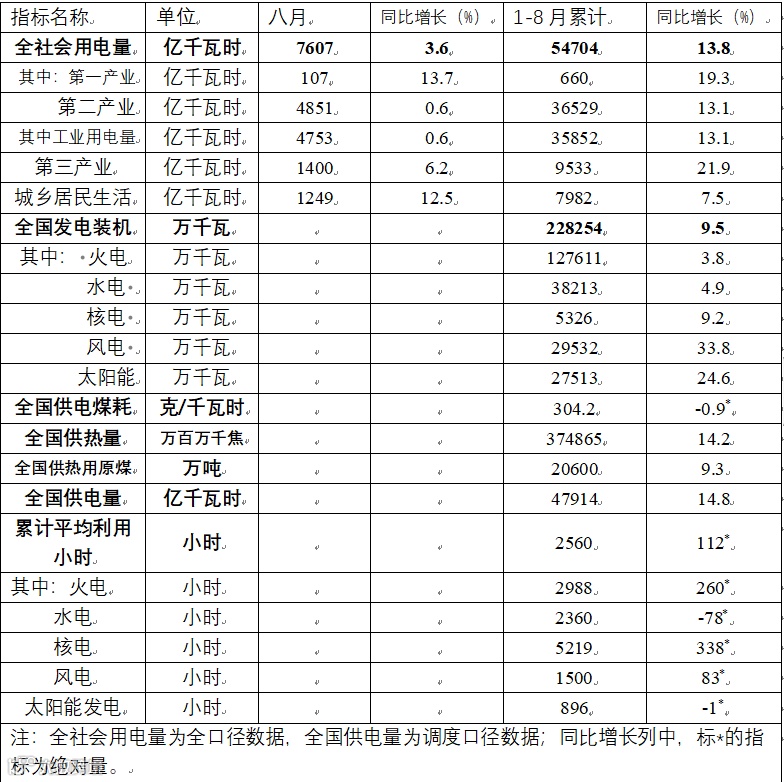 9月18日,国家能源局发布1-8月份全国电力工业统计数据。截至8月底,全国发电装机容量22.8亿千瓦,同比增长9.5%。其中,风电装机容量约3.0亿千瓦,同比增长33.8%。太阳能发电装机容量约2.8亿千瓦,同比增长24.6%。