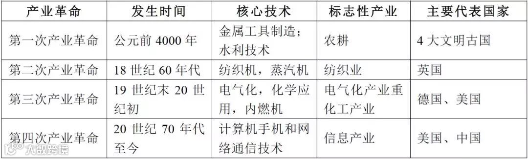 公元前4000年左右,四大文明古国巴比伦、埃及、印度以及中国的黄河流域,出现的以金属工具制造、使用和以水利技术大力发展为标志的农业革命,可视为人类第一次技术与产业革命。一直延续至18世纪60年代,在英国发生了以纺织机的发明和蒸汽机作为动力广泛使用为标志的第二次产业革命(第一次工业革命);19世纪末20世纪初,德国和美国引领了以电气化、化学应用和内燃机三项技术的发明和使用为标志的三次产业革命(第二次工业更);20世纪70年代至今,特别是90年代以来,以计算机与手机的普及应用,网络与通信技术的结合带来的信息产业大发展,带来的第四次产业革命(信息产业革命),这一次,中国抓住机遇,成为与美国并驾齐驱的信息产业强国。从时间轴看,产业革命呈现加速趋势。