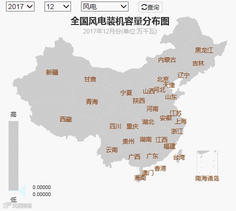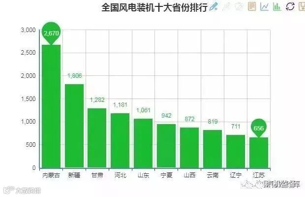 截止2017年底,全国十大风电装机省份分别是:内蒙古2670万千瓦、新疆1806万千瓦、甘肃1282万千瓦、河北1181万千瓦、山东1061万千瓦、宁夏942万千瓦、山西872万千瓦、云南819万千瓦、辽宁711万千瓦、江苏656万千瓦。