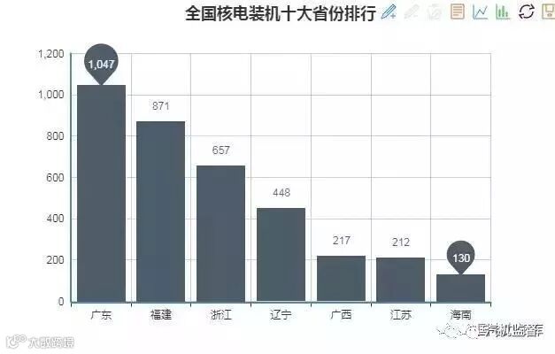 截止2017年底,全国七大核电装机省份分别是:广东1047万千瓦、福建871万千瓦、浙江657万千瓦、辽宁448万千瓦、广西217万千瓦、江苏212万千瓦、海南130万千瓦。