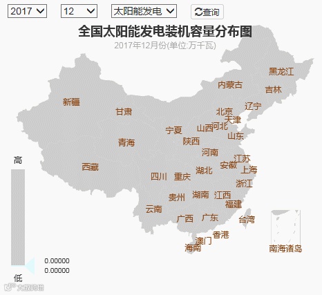 截止2017年底,全国十大太阳能发电装机省份分别是:山东1052万千瓦、新疆933万千瓦、江苏907万千瓦、安徽888万千瓦、河北868万千瓦、浙江814万千瓦、青海791万千瓦、甘肃786万千瓦、内蒙古743万千瓦、河南703万千瓦。