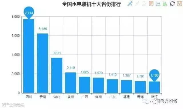 截止2017年底,全国十大水电装机省份分别是:四川7714万千瓦、云南6186万千瓦、湖北3671万千瓦、贵州2119万千瓦、广西1665万千瓦、湖南1570万千瓦、广东1410万千瓦、福建1307万千瓦、青海1191万千瓦、浙江1160万千瓦。