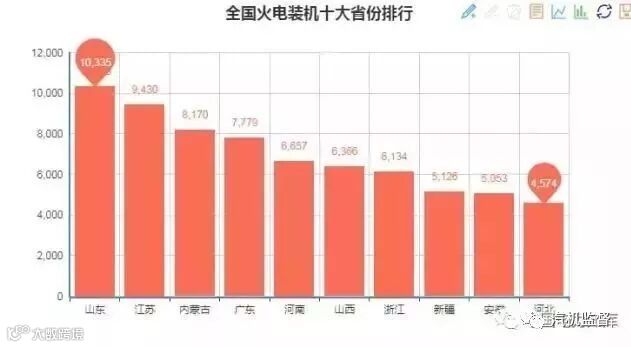 截止2017年底,全国十大火电装机省份分别是:山东10335万千瓦、江苏9430万千瓦、内蒙古8170万千瓦、广东7779万千瓦、河南6657万千瓦、山西6366万千瓦、浙江6134万千瓦、新疆5126万千瓦、安徽5053万千瓦、河北4574万千瓦。
