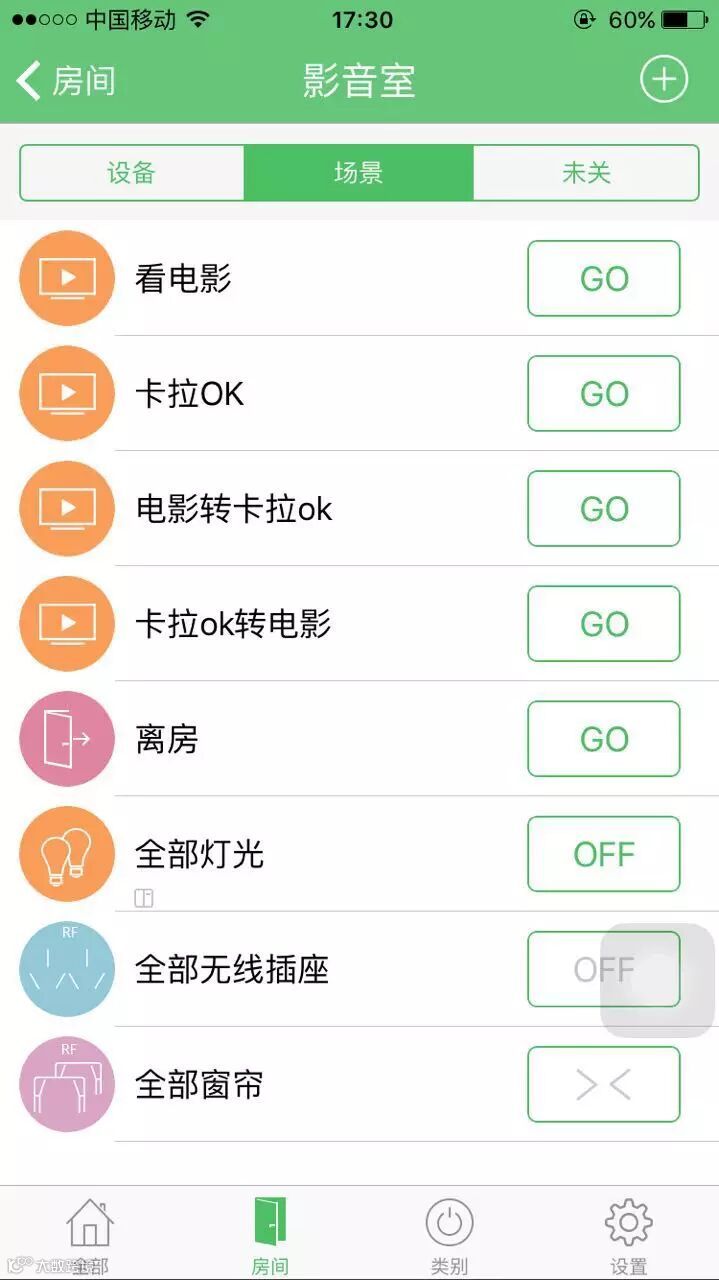 ·离房模式—灯光依次亮起,所有设备自动关闭,电动窗帘延时打开(关闭)