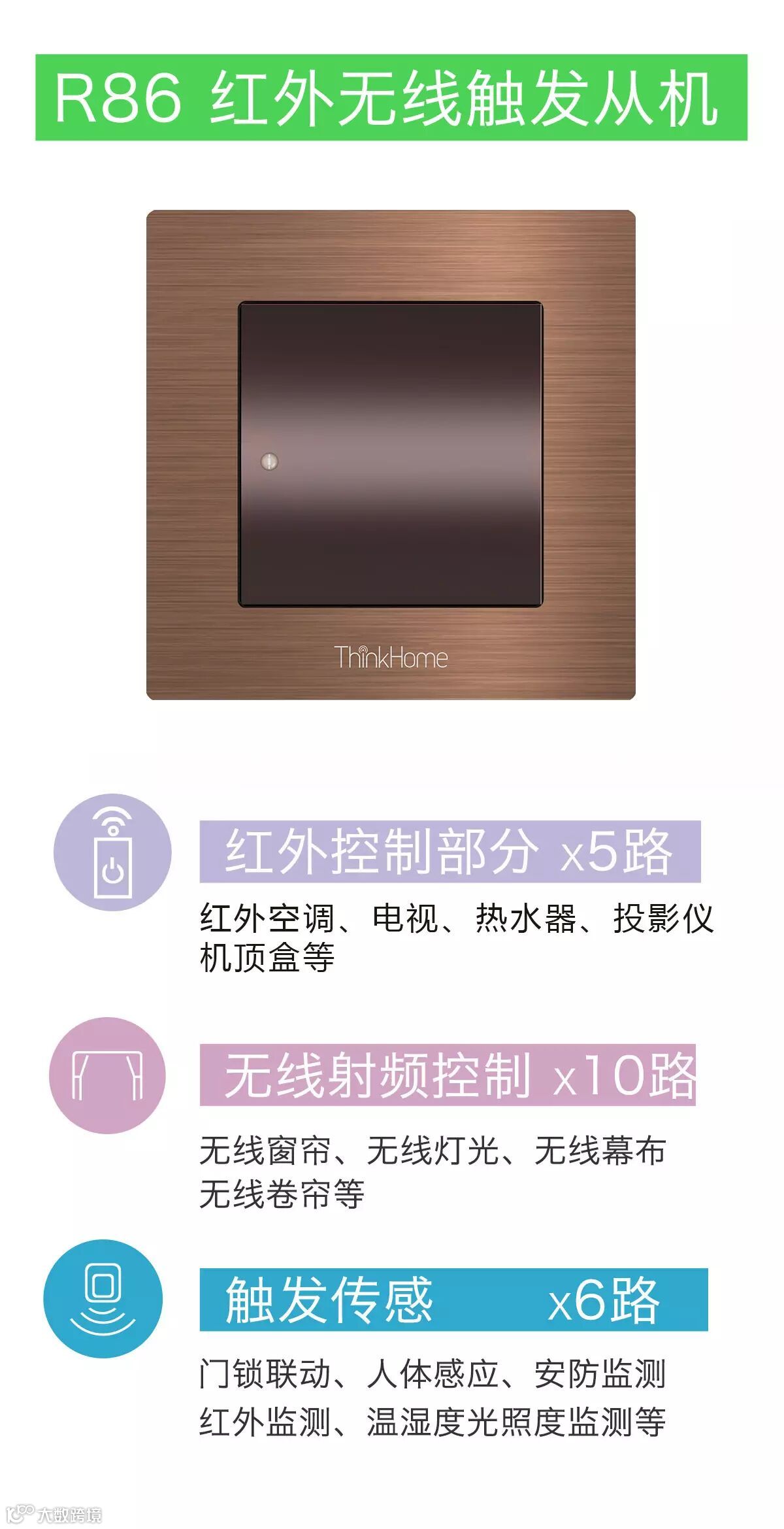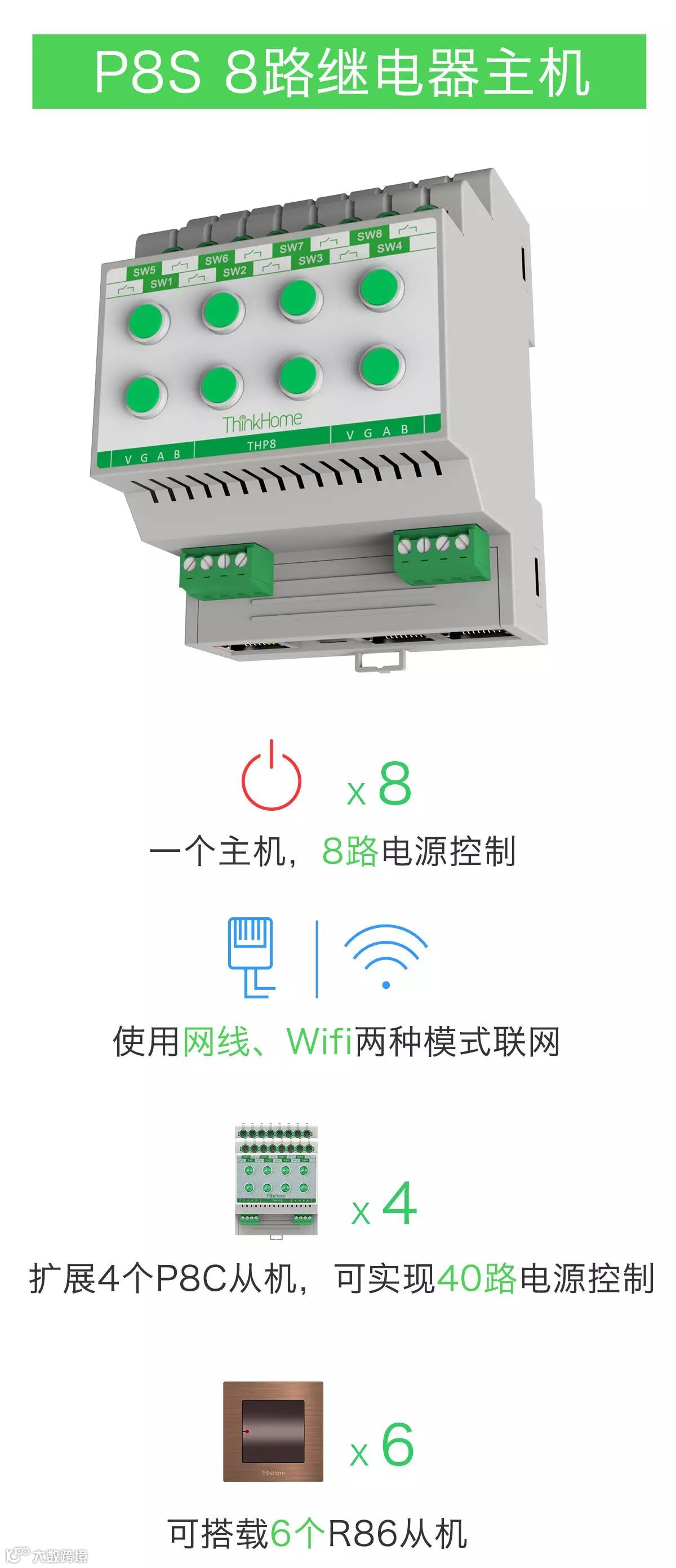 以P8系列主从机为核心产品,结合R86红外无线触发产品以及无源无线动能开关,ThinkHome将向您展现前所未见的全宅智能解决方案。