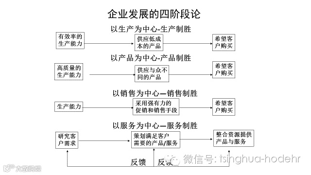 为什么这么说呢?就是因为现在技术发展太快了、行为变化太大了、跨界经营容易了、模式创新也总是出乎人们的意料。以往可能成功的经验主义和教条主义已经不管用了。就连工业时代被奉为经典的很多管理理论和管理方法也有了过时的趋势。如下图所示,企业、尤其是制造业,经历了生产制胜、产品制胜、销售制胜的阶段,现在进入了服务制胜阶段,传统的做企业的思路不得不改变了。