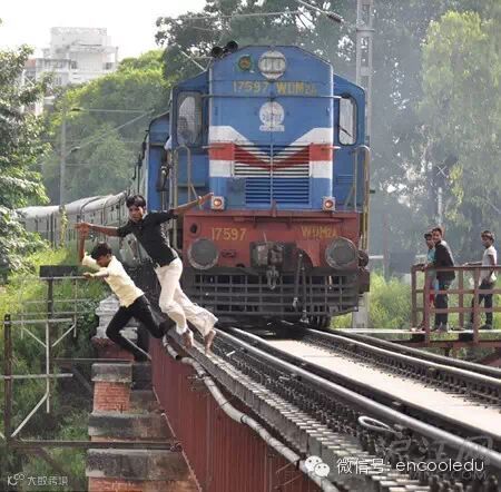 有人看到,这群孩子在印度北方邦勒克瑙市的Daliganj铁路桥跳轨,身后就是疾驰而来的客运列车。