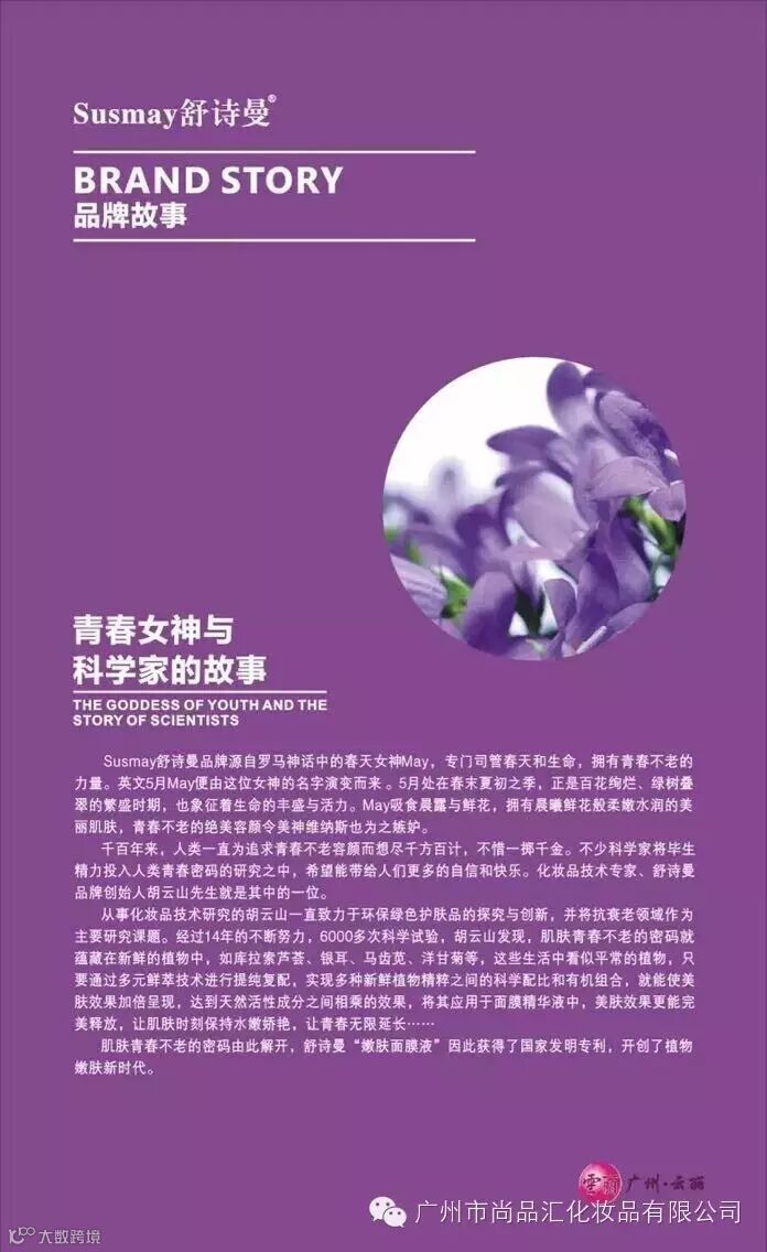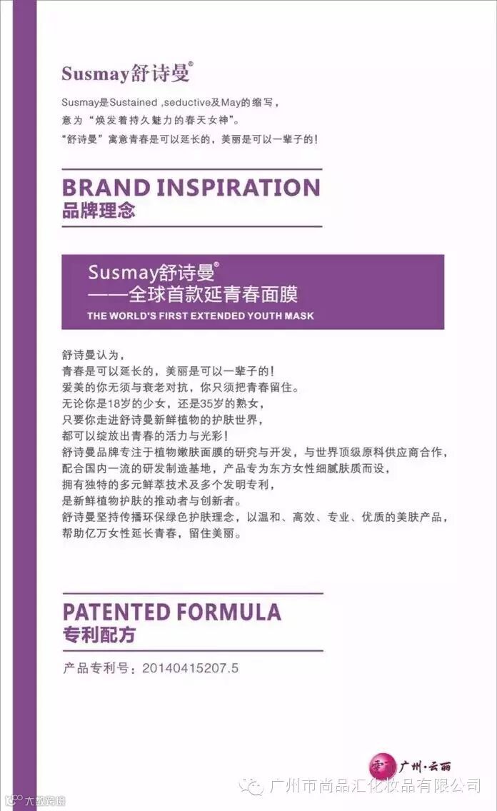 舒诗曼首创延青春面膜专利配方,独特的多元鲜萃科技,植物水润配方,以敷面膜方式代替繁杂的护肤及底妆程序,5分钟轻松遮盖黄气、暗沉、毛孔、痘印、斑点,令肌肤呈现细致无瑕、晶莹如玉质感,营造媲美天然素肌的自然肤色。