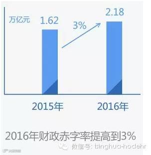 12.【报告内容】2015年财政赤字规模为1.62万亿元,2016年拟安排财政赤字2.18万亿元,赤字率提高到3%。比去年增加5600亿元。