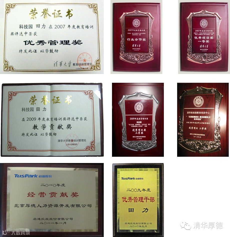 清华科技园教育培训中心在推广培训的过程中,坚持不做广告、不印招生简章、不发展和依靠招生代理。坚持口碑相传,坚守一个行业、深入服务一个行业,所有客户都是“回头客”。多年来持续荣获清华大学教育培训领域的多项奖励和荣誉。本文中列出了一部分获奖证书的照片。其中“战略之旅”工作坊课程荣获2009年度清华大学教学贡献奖。