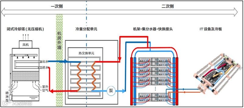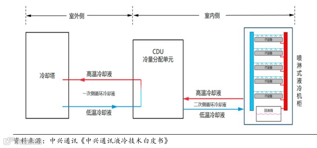 喷淋式液冷散热,是区别于浸没式液冷的另一种直接接触型液冷散热。在喷淋式液冷散热中,冷却液/冷却介质将会被直接喷淋至服务器等发热元器件上,通过液体的流动与蒸发进行热交换以实现散热。被喷淋后的冷却液完成热交换后会进行循环回收喷洒,成本显著低于浸没式散热,但同时散热效率也有所降低。