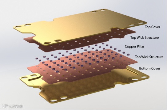 Vapor Chamber真空腔均热板由两块铜板围成,内部有空腔,空腔内部壁面有毛细结构和支撑铜柱。空腔内部抽真空后一般会填充一定量的工质,在蒸发区利用工质从液态变为气态吸收热量,在冷凝端被冷凝放热后再次相变,从气态变成液态,然后利用毛细结构的毛细力回到蒸发区,原理上类似于热管,但在传导方式上有所区别。