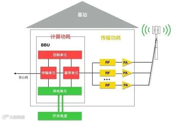 比4G提速10倍的数据传输速率的背后,是更多的基站,更大的功率,指数级增长的发热量。5G基站功耗大致分为传输功耗、计算功耗和额外功耗。