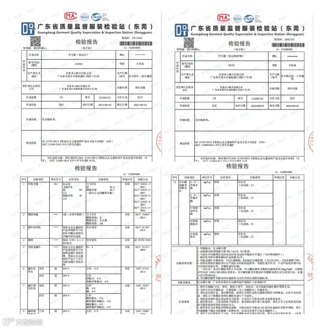 在选择校服时候我们往往看重校服的“颜值和价格”,但安全质量才是我们不能❌触碰的底线。每年我司都会将生产的校服送到广东省质量监督服装检验站(东莞)进行检验,确保每一件校服都符合国家GB/T 31888-2015《中小学生校服》标准。高品质校服的选择是保障学生健康和舒适度的重要环节,同时也是我们一直坚持的生产理念!