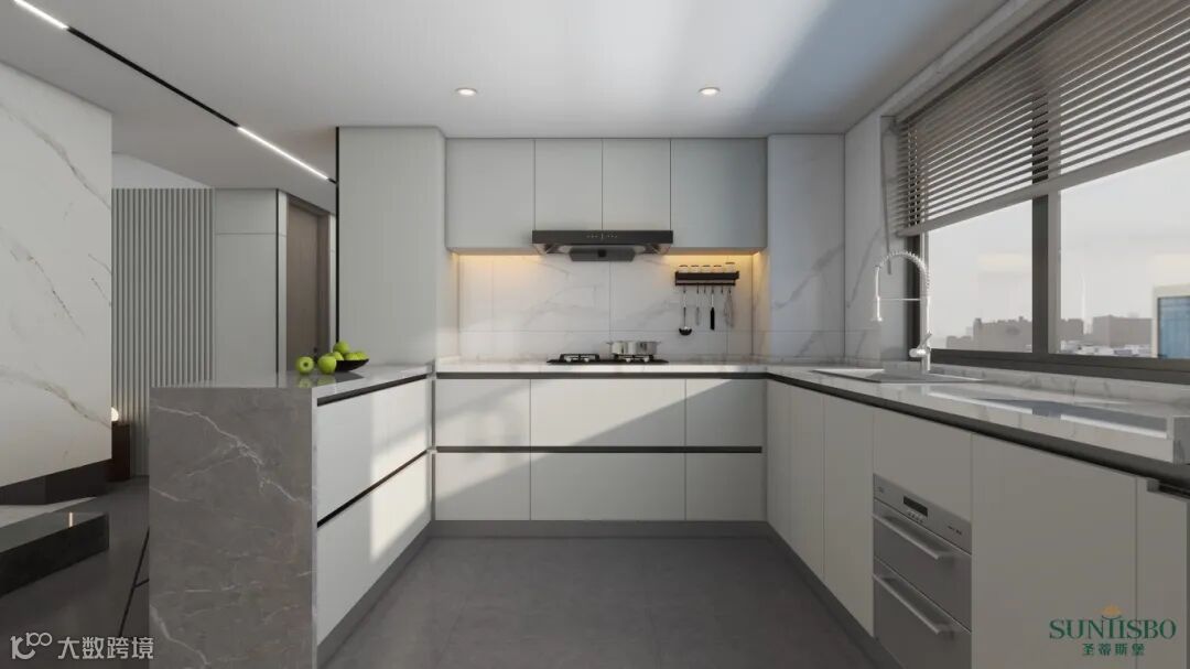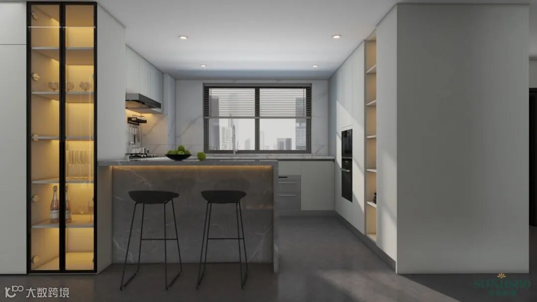 餐区的对面是厨房,设计师将原本的厨房做了延伸,利用大理石白色墙体和灰色柜体展露这无尽的优雅姿态。合理的柜体组合设计将烹饪区、储物收纳区、备餐清洗区安置的井井有条。