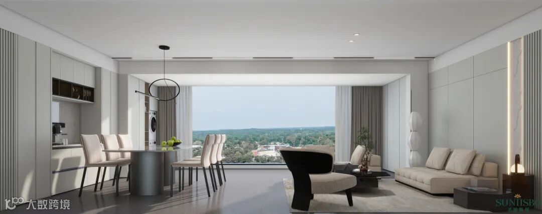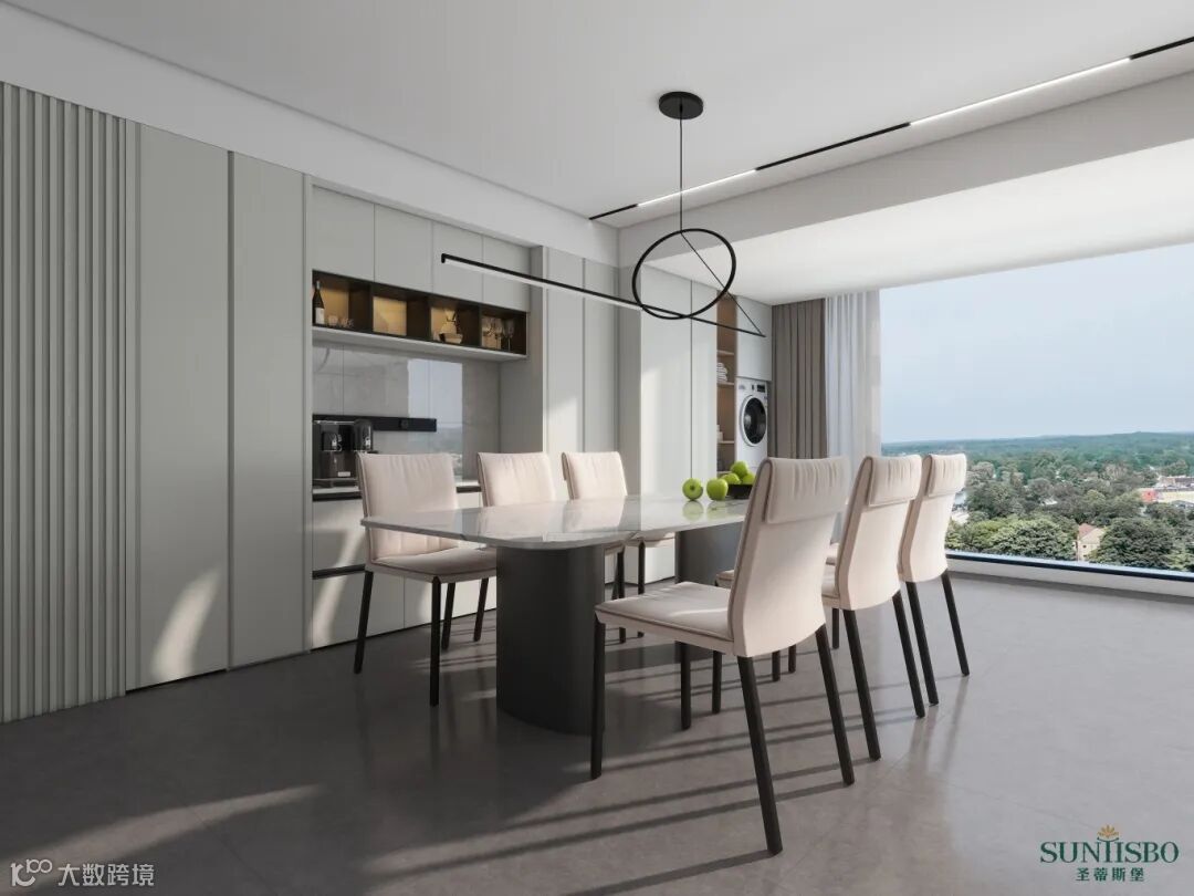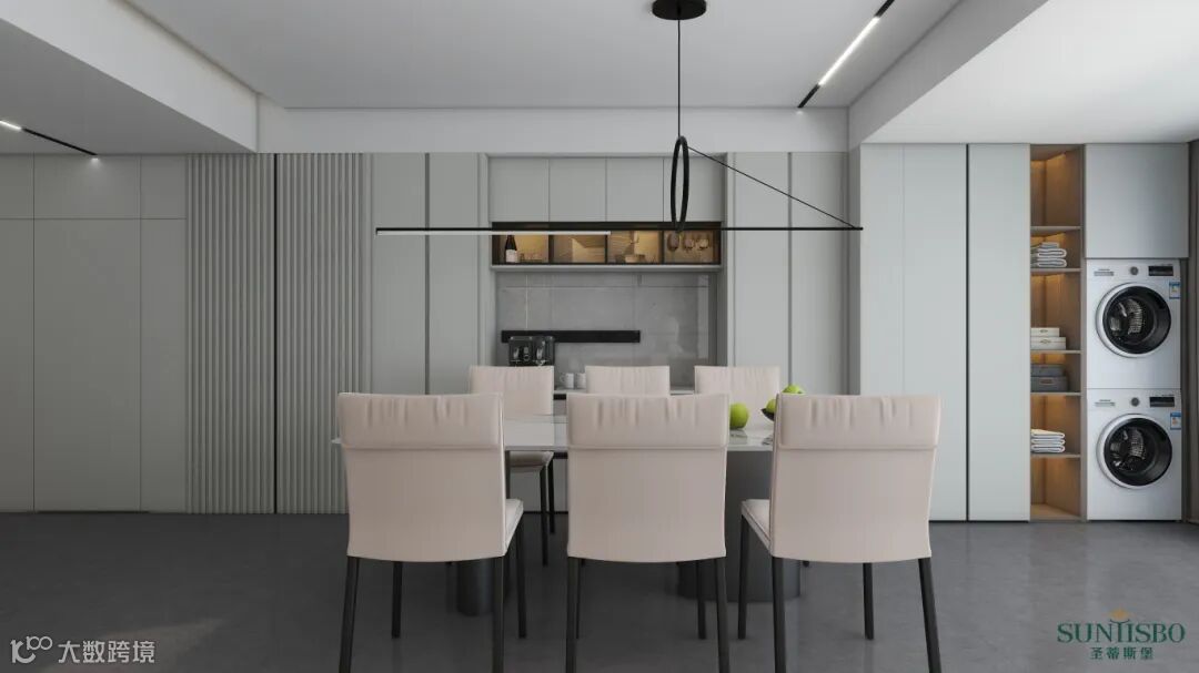 客餐厅一体化的设计大大减少空间与空间之间的阻碍,各个功能区之间相互独立又相互贯通,增强空间的流动性,同时也促进了家人之间的互动性。