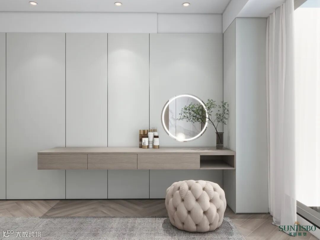 这套案例,圣蒂斯堡全案设计师采用低饱和度的色彩搭配,自然的肌理,留下不同的视觉感受,这是设计师精心打磨的结果。对于不同使用功能的空间,并没有过多的装饰,而是通过材质本身来传递空间极简高级的氛围,展现空间本真的魅力。