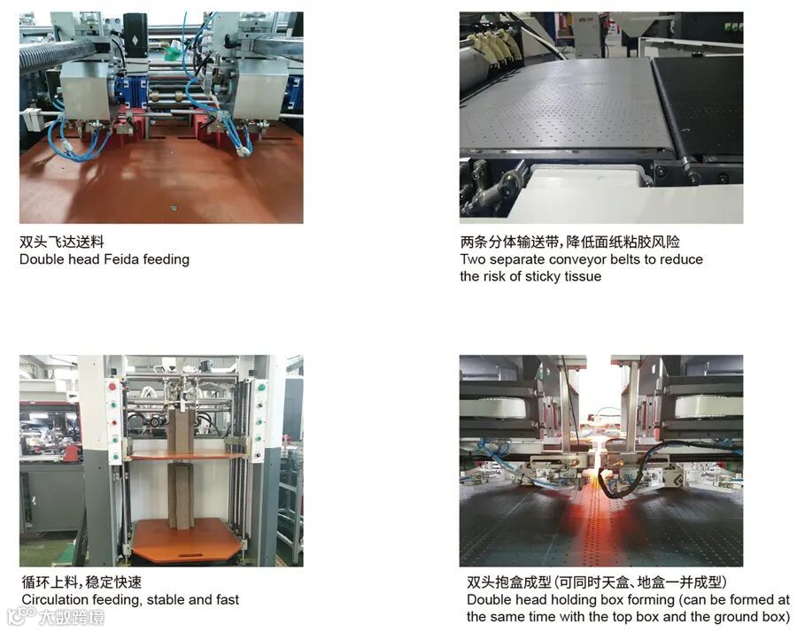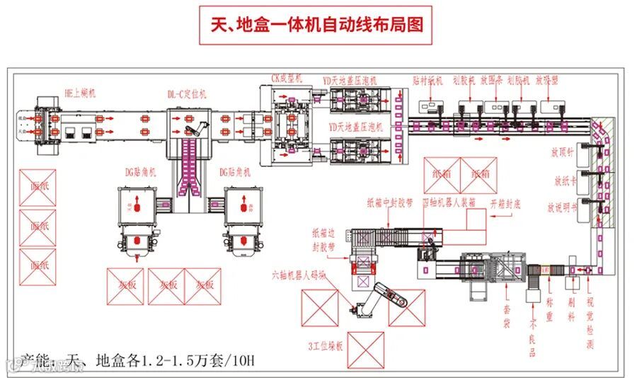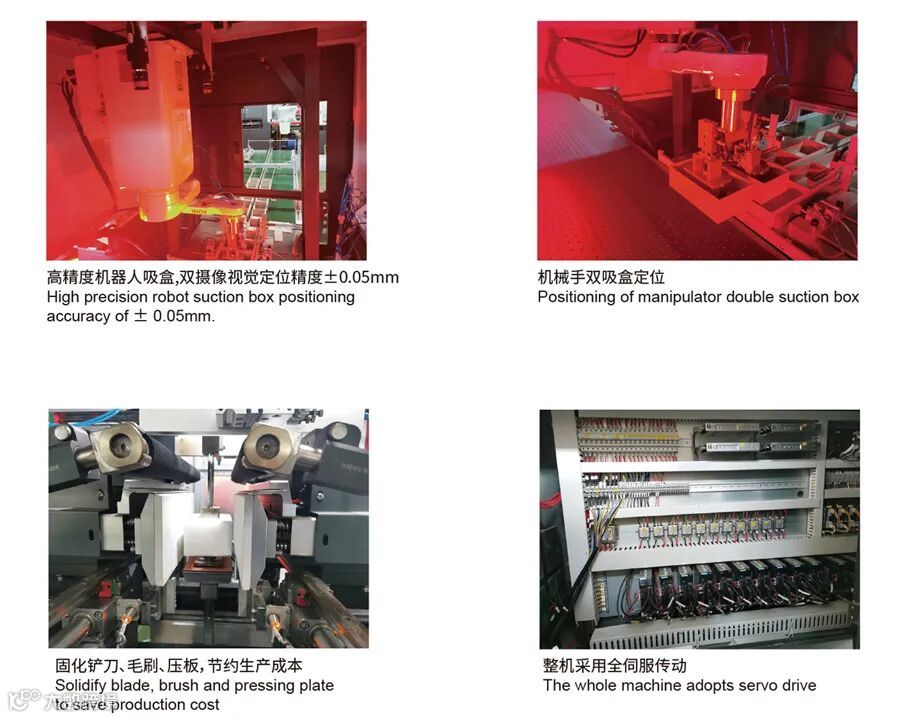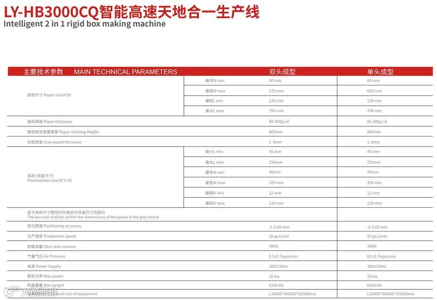 LY-HB3000CQ智能高速天地合一生产线采用高精度的视觉定位,定位精度达到±0.05mm;整机采用智能化PLC控制,操作简单。设备每分钟的效率可达到50个,在这个“智能高速”的潮流中力顺源智能以高效完成生产,让机器替代人工生产。在生产上,设备可同时生产天/地盒,节约场地空间,前端天地盒的生产平衡率达100%。在稳定性上,可单边转版、换模,保障正常生产。