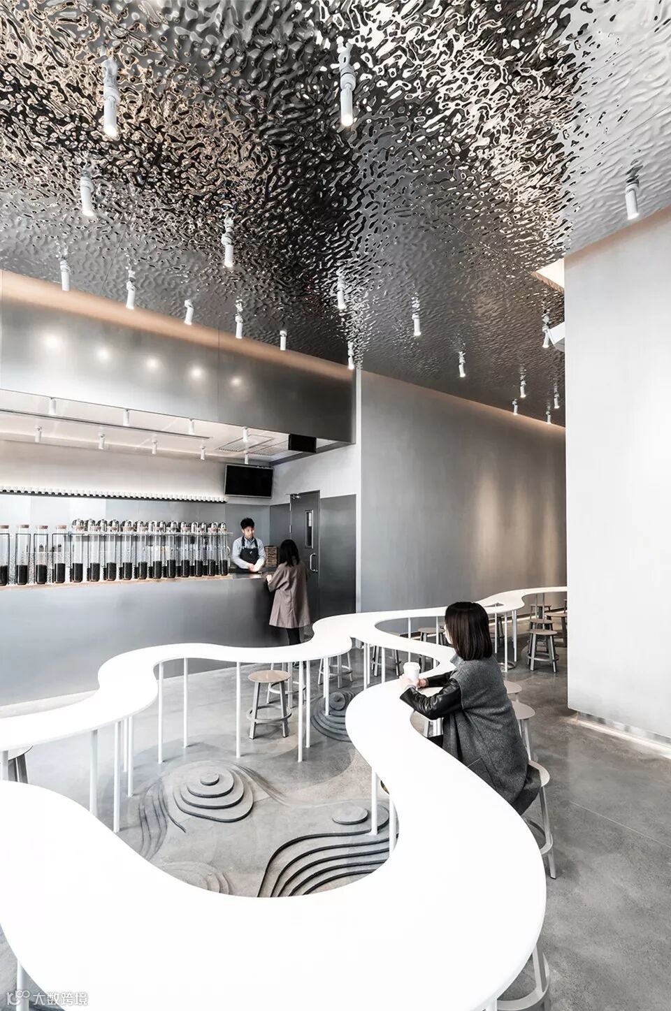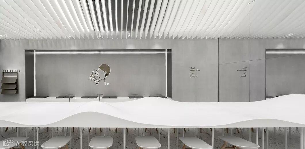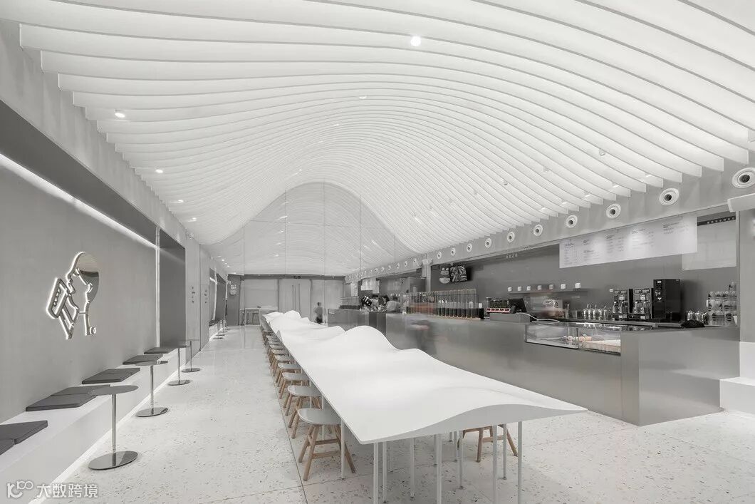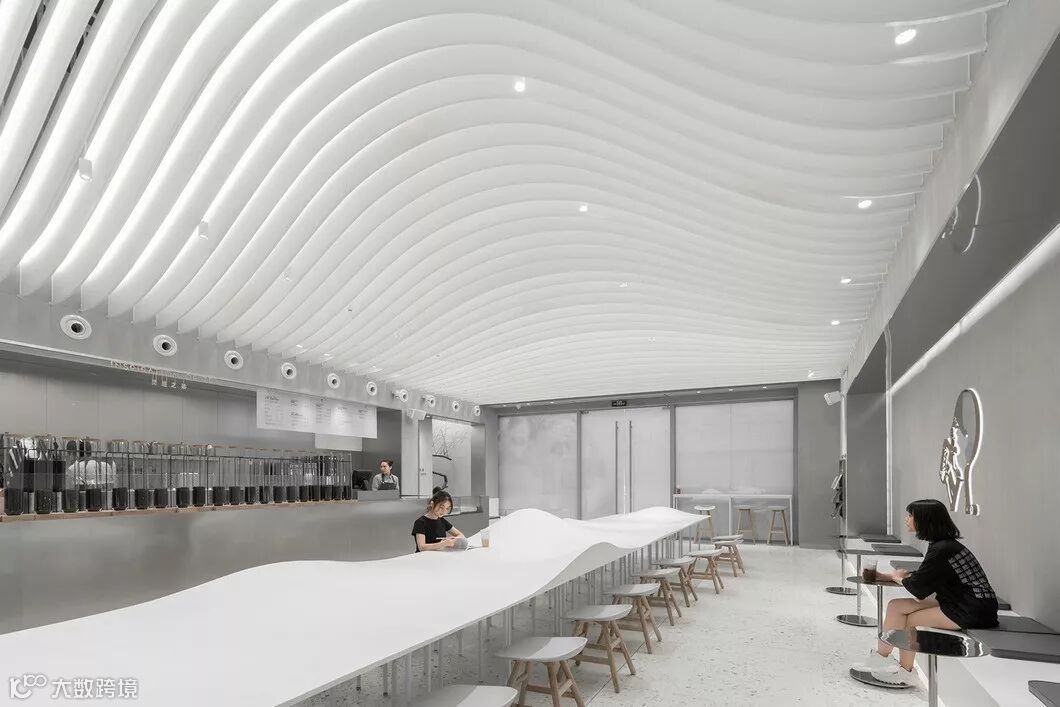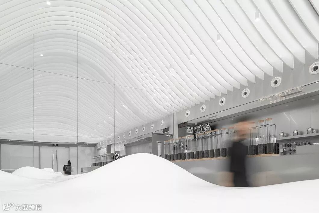与普通茶饮店分散的布置方式不同,贯穿整个空间的长桌把茶客们聚合起来,桌面上不规则隆起的山丘,在功能上区隔了不同组别的茶客,在形式上如若层云叠嶂的东方意象。天顶之上是山形的白色弧形顶棚,如无垠穹顶笼罩四野。