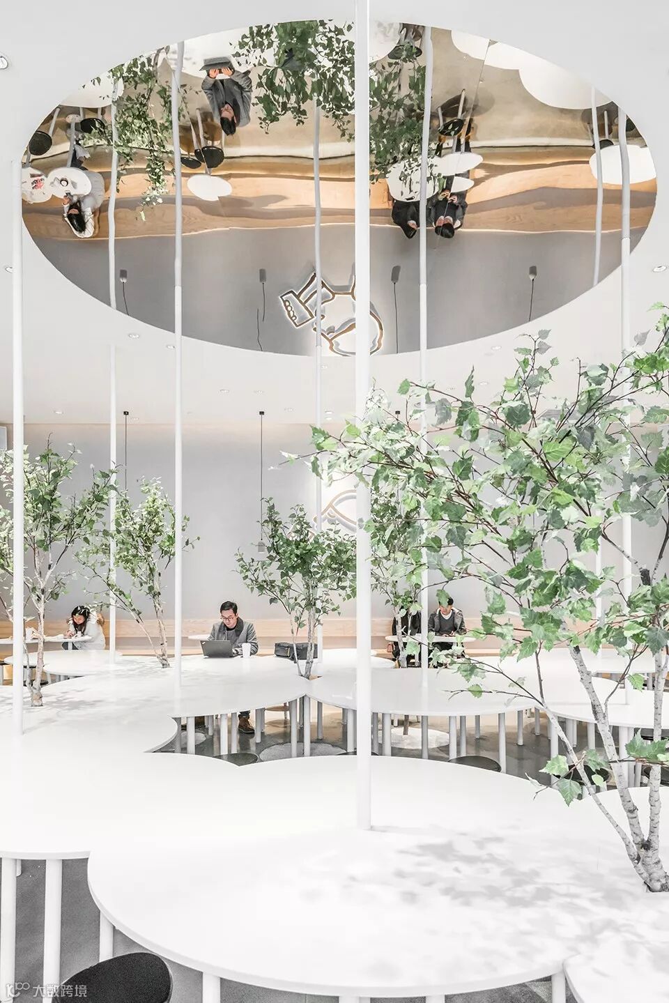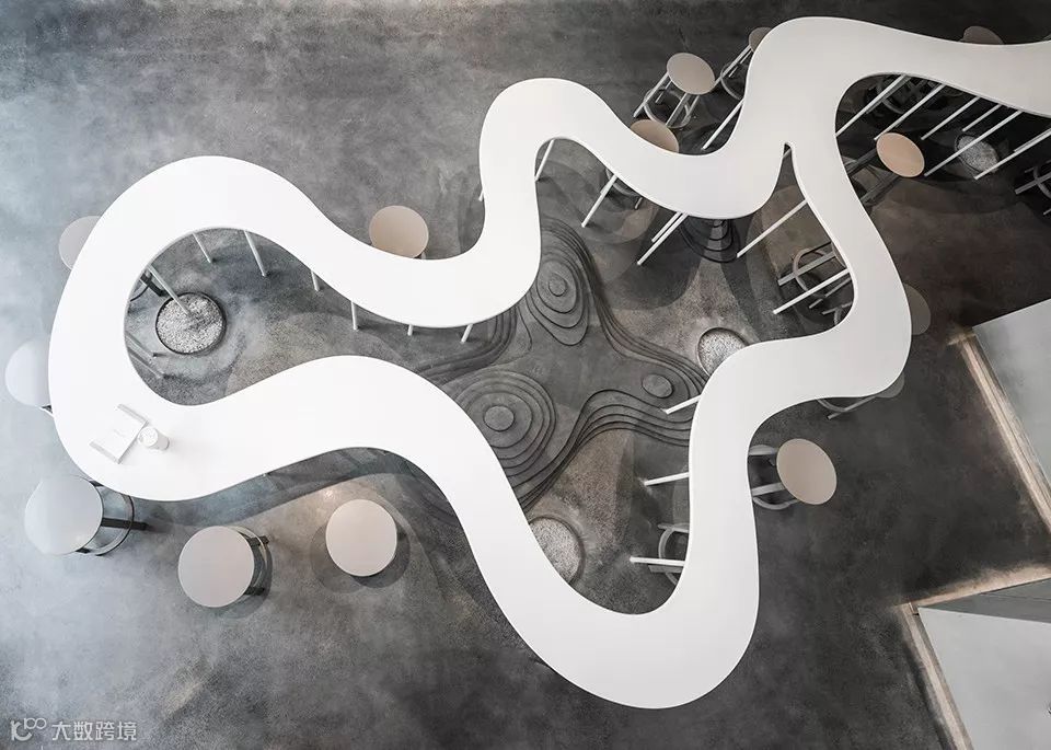 用自然的曲线来串联各个尺度的桌子,充分利用空间的同时,也制造出人与人之间不同的距离