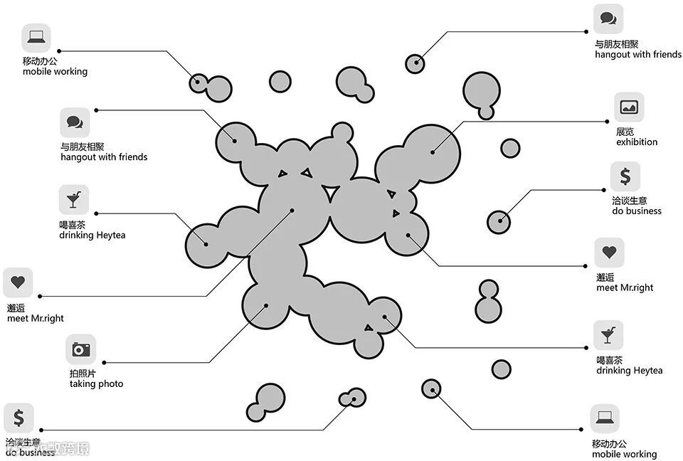 在这个特殊的结构中个体活动会牵连到整体的结构活动,另一方面整体结构也影响并制约着个体的活动。同时,相类似的个体行动者在社会空间中的位置也是接近的,并拥有相似的性格、兴趣和实践活动。小尺度空间让人感到亲近,可以方便更展开的话题,大尺度的空间则有更大的包容性和可能性。不同距离所产生的交流活动也各有不同,关于距离与人活动的关系随处可见。