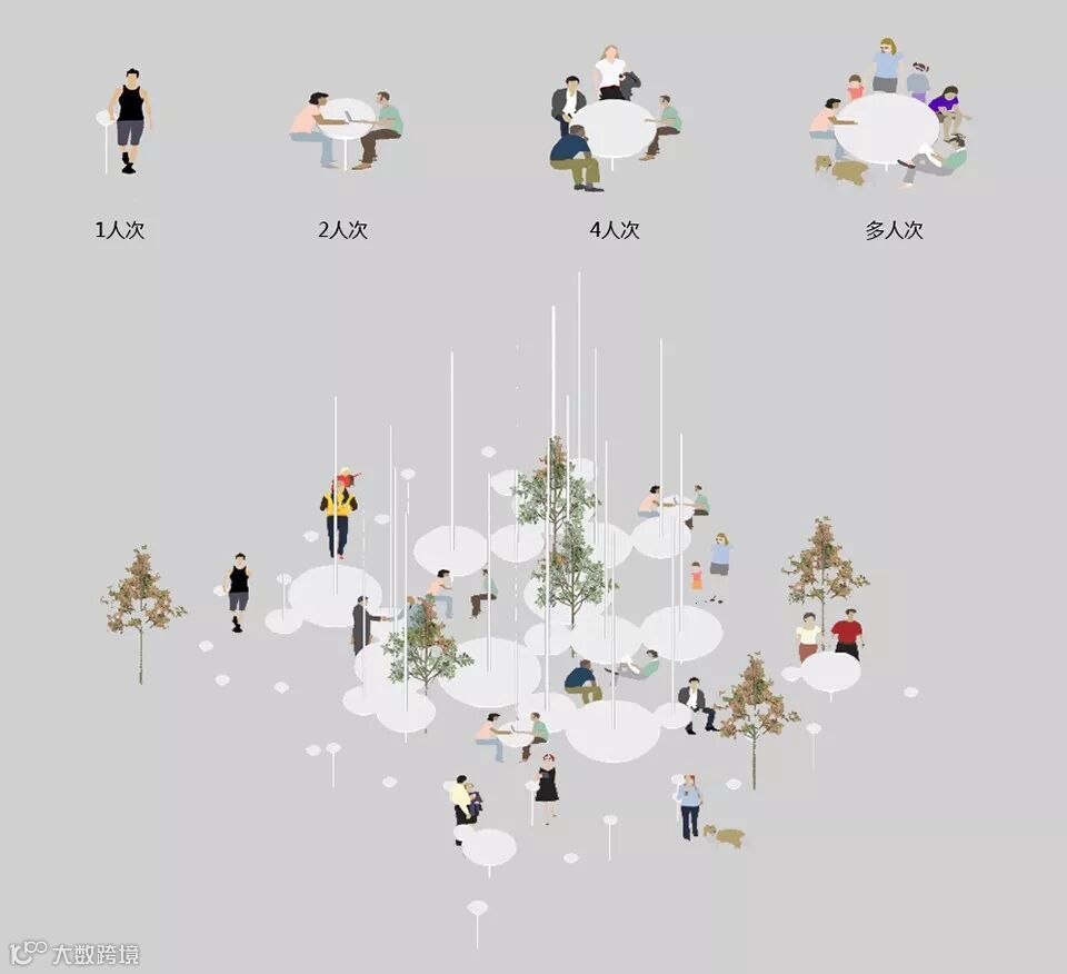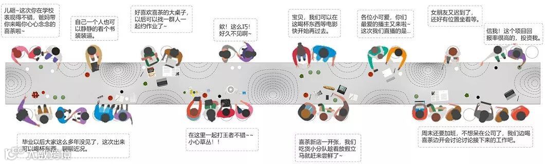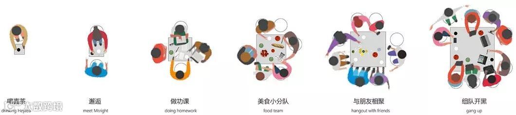 将不同尺寸的小圆桌拼成一张大桌,人和人之间形成了新的距离,为人们的互动提供了可能