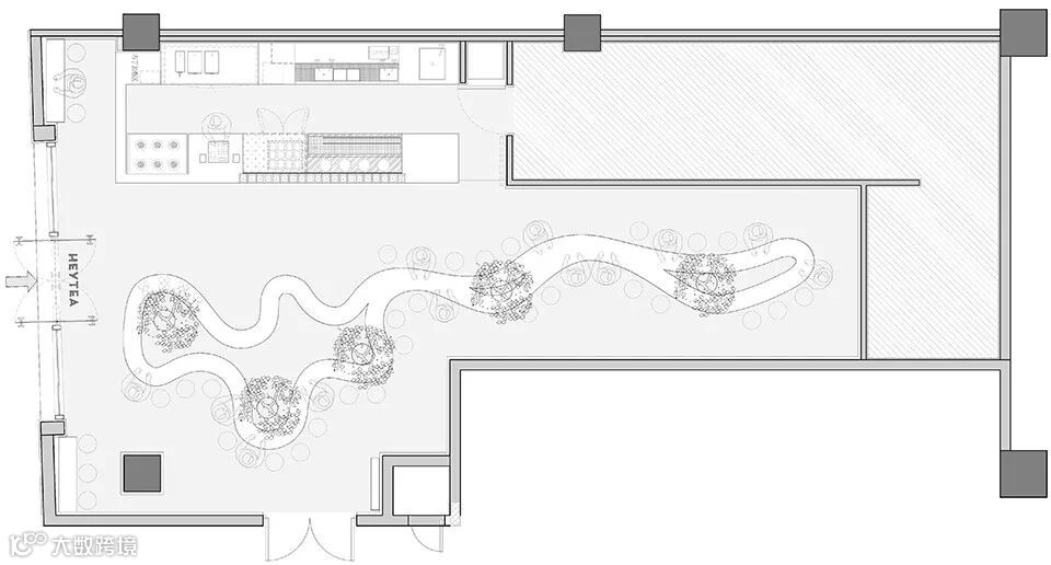 山溪两侧可坐宾客30余人,绿意盎然的植物穿插其中,顶部起伏的水波纹隐隐荡漾