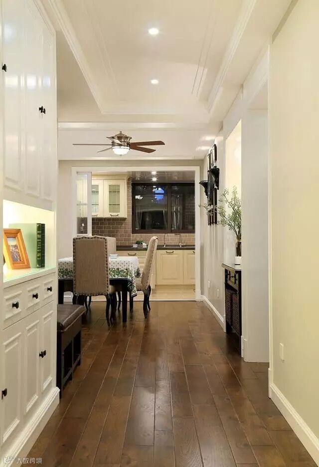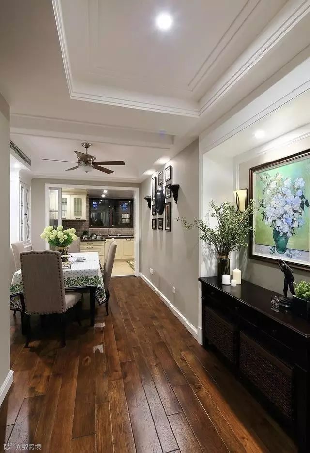 ▲墙壁凹处摆一个储物柜,上面摆一瓶花枝,墙上挂一幅挂画,过道也变得美美的。