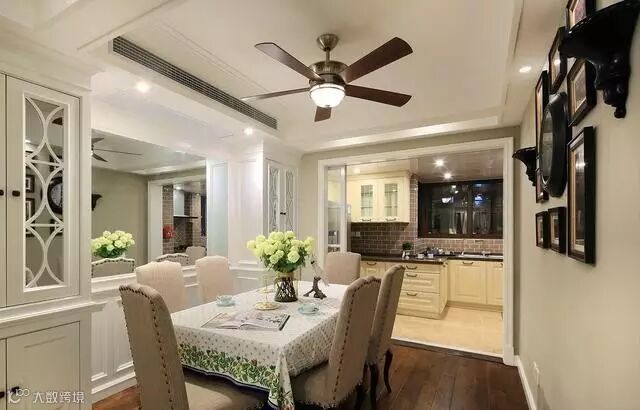 ▲橘粉色餐桌上铺一块碎花桌布清新、明净。顶上一盏吊扇灯造型独特,复古的颜色搭配现代的灯饰古典、浪漫。