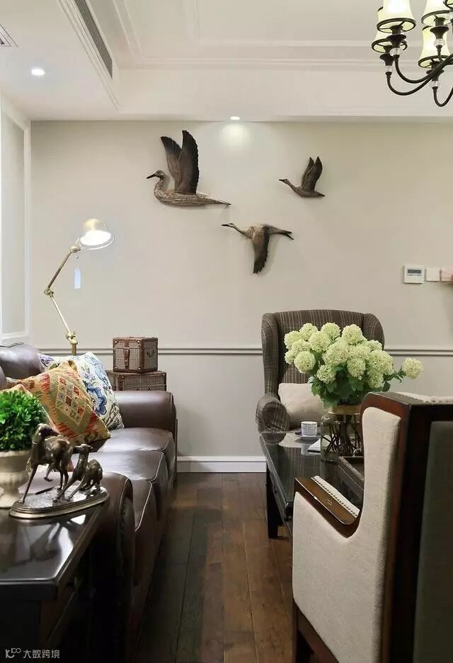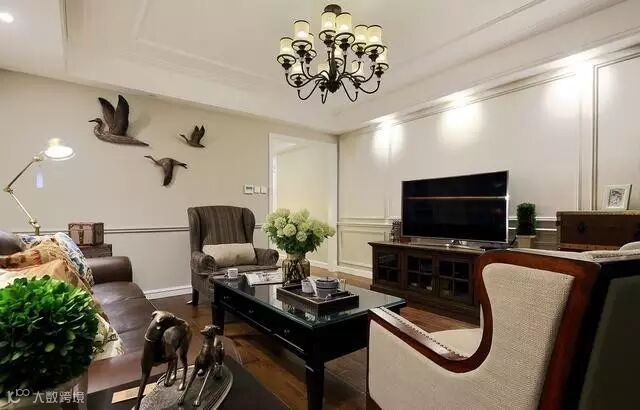 ▲一排巧克力色皮质沙发搭配两个单人沙发显得高端、大气。两层棕色电视柜让客厅充满了复古气息。
