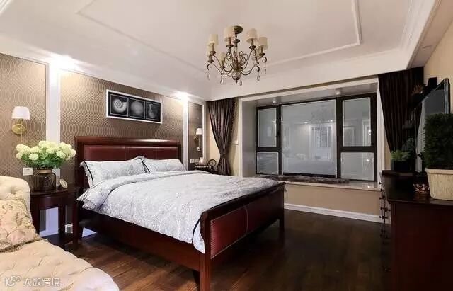 ▲深红色大床上一床浅紫色被子,再加上深色木质地板,卧室安静、低调,在这样的环境中很容易入眠。