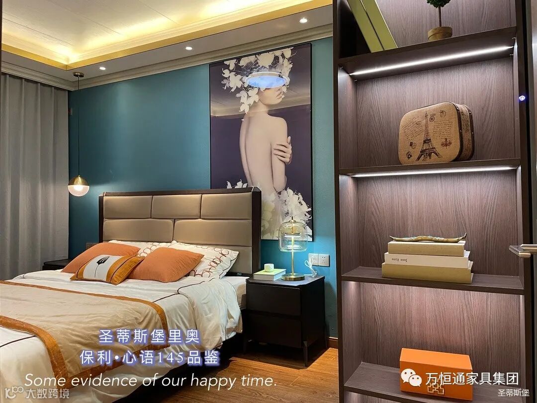 ▲床屏简约的线条与定制柜的功能设置让贴墙的艺术挂画,散发出优雅而大胆的美感。