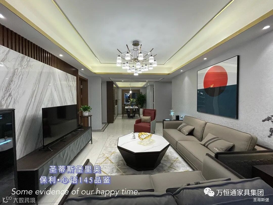 ▲客厅以灰色为主调,电视背景墙采用拼接大理石搭配实木阑珊,与对立墙面形成撞色处理,既可以加深空间层次感,也提升了空间明亮度。一字型真皮沙发与实木电视柜中和了大空间的空旷,打造出一个谈心叙话的和谐空间。