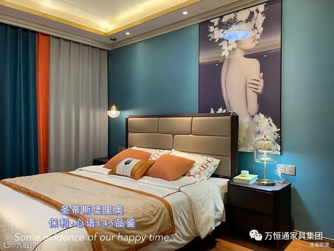 ▲主卧的每个区域都是根据业主意向精心打造。业主在主卧想要一些与众不同的色彩,所以大胆使用了色彩饱和度高的蓝绿,装饰则由色彩跳脱的鲜橙点缀,奇妙却和谐的混搭在空间中,冲突感十足。