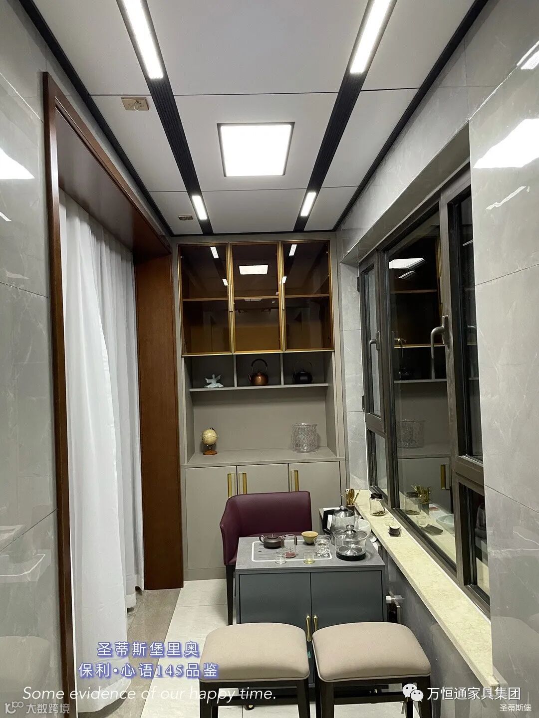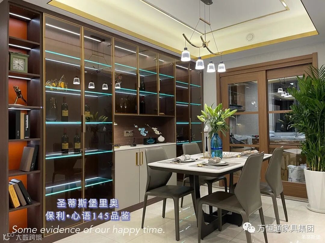 ▲餐厅一面及顶的透明柜体,以简练的金属线条分割出收纳空间,让立面视觉更显精致干净。餐边柜设置了台面、全玻璃展示区以及隐藏收纳区,满足了日常生活中多样的收纳需求。