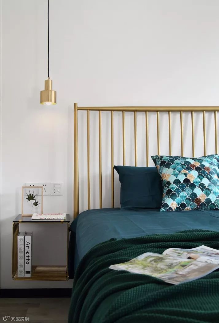 ▲ 主卧选择了金色铁艺床,悬空的置物架取代了普通的落地床头柜,带来的轻盈感又减轻了色彩上的厚重感,一举两得。