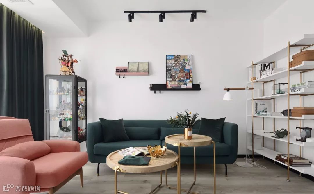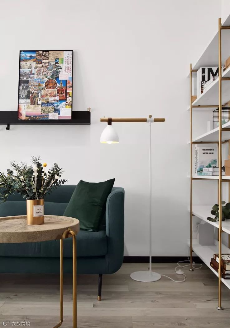 ▲ 茶几上金色花瓣状果盘和金色光面花瓶点缀其中,使得整个空间中北欧风与复古情调兼具。
